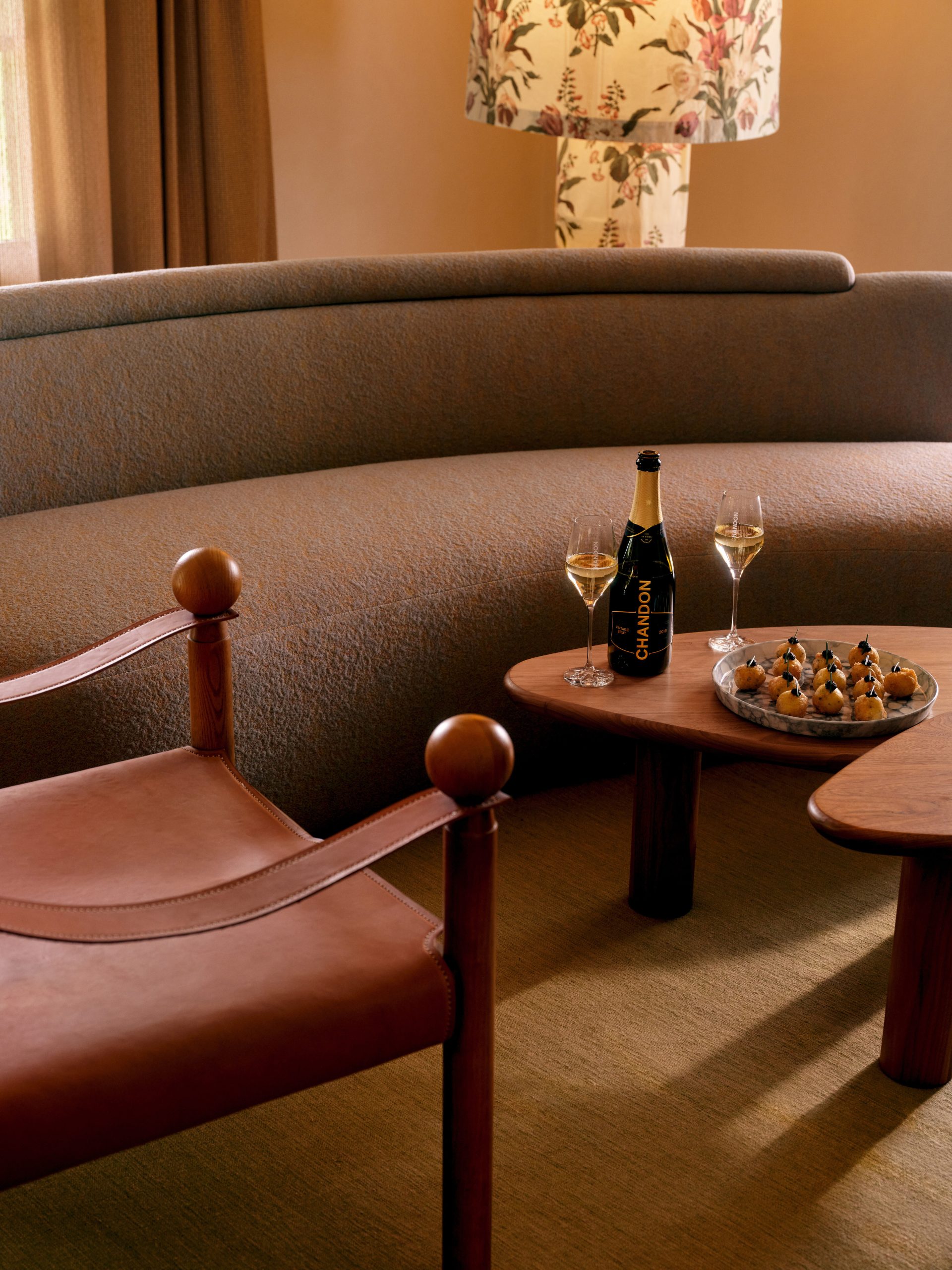 The newly reimagined Homestead is Chandon’s most exclusive private event space. Originally an 1880s farmhouse, the venue was thoughtfully restored by Melanie Beynon Architecture & Design to blend historical charm with understated, contemporary luxury. It features custom handcrafted lighting, original Australian artworks, rose-tinted mirrors reflecting Chandon’s signature rosé, and sweeping, uninterrupted views of the Yarra Ranges and vineyards.